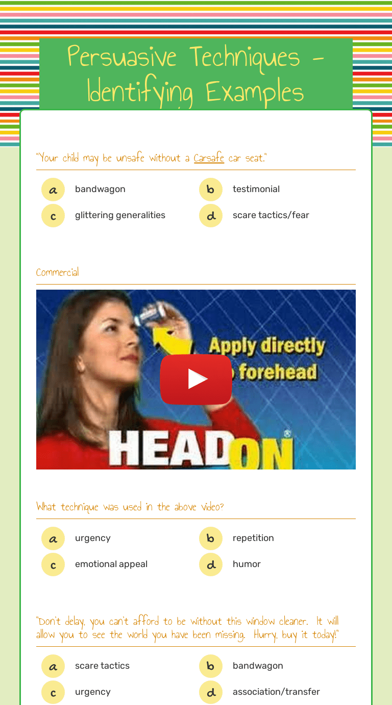 The practice and ethics of public speakingfeatures two key themes. Persuasive writing, for example, may call upon pathos as well as logos; This holiday leaflet writing sample is a fantastic tool to use when you're teaching persuasive writing. Students read each example, determine the technique, and explain their answers. They are some wild cards.